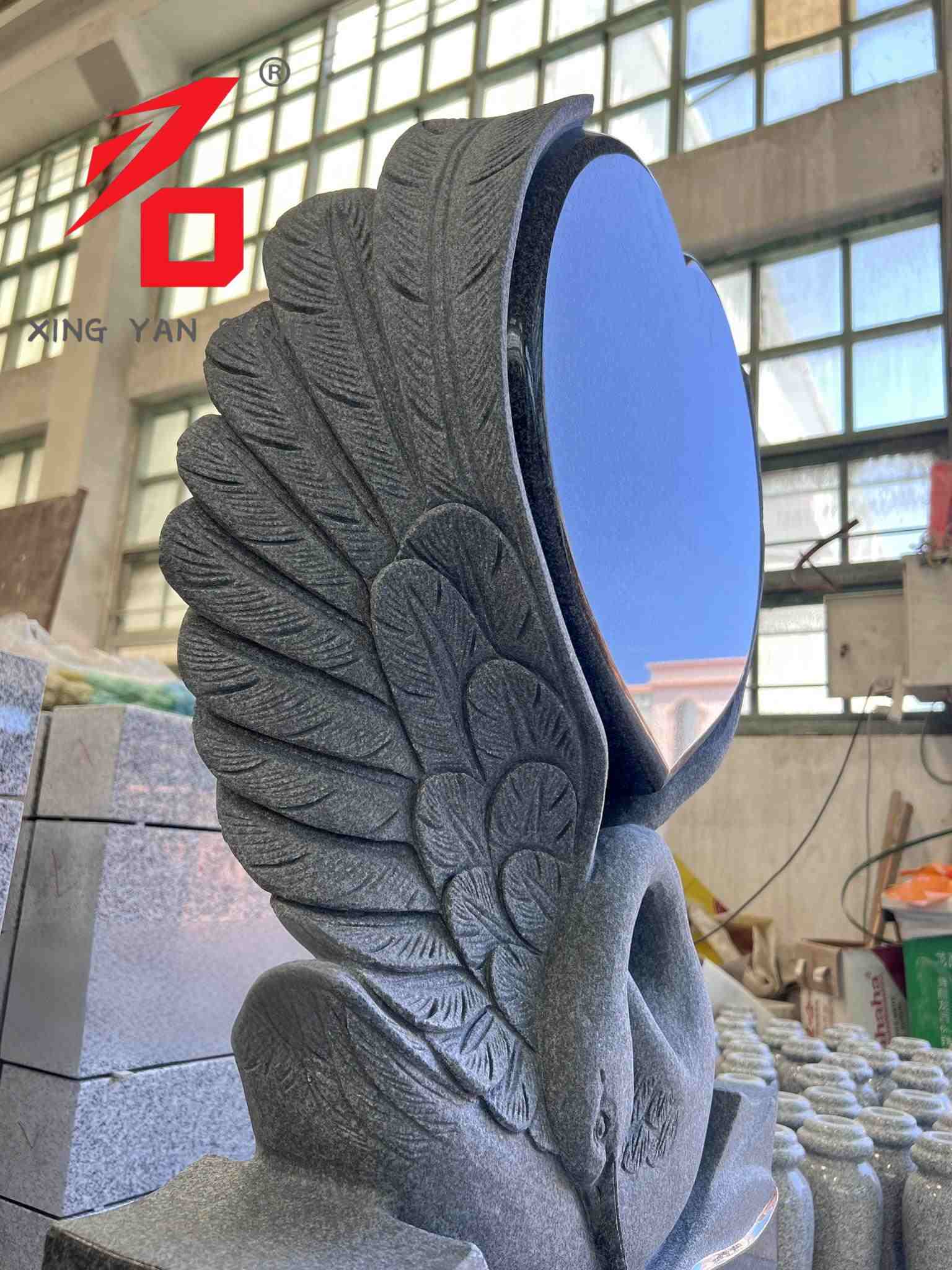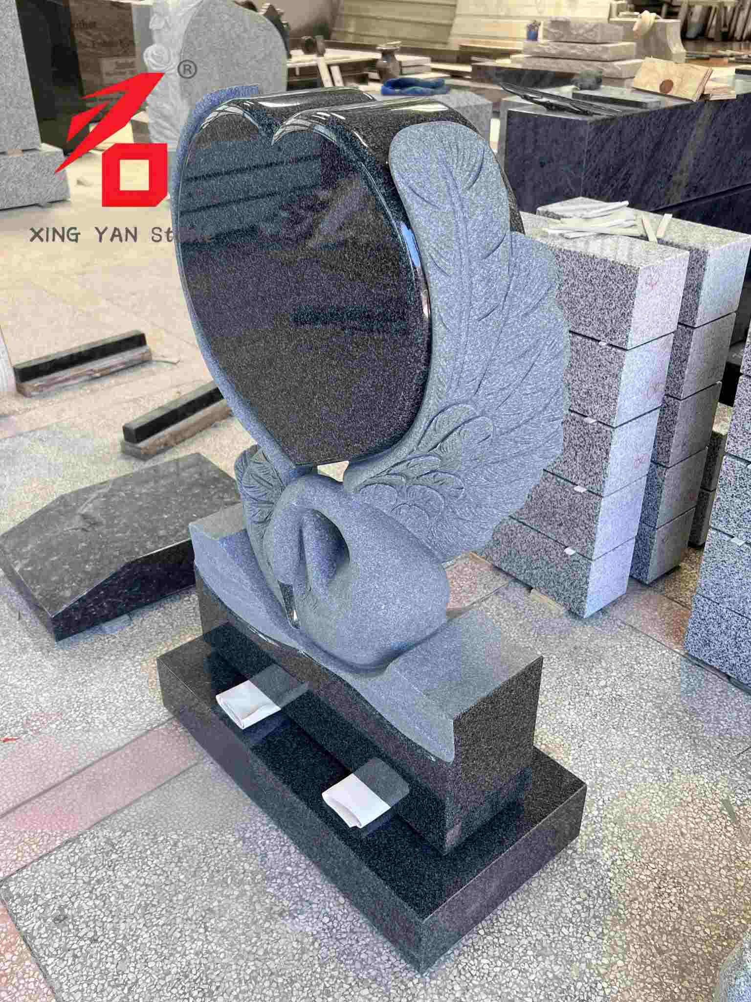 Dearadh: Is croí dubh snasta an príomhchorp, le sciatháin eala saolta snoite taobh thiar de. Léiríonn cruth agus croí na heala grá agus cuimhneachán síoraí don duine nach maireann. Tá an dearadh foriomlán an-ealaíonta, rud a dhéanann idirdhealú idir é agus stíl monotonous na leaca uaighe traidisiúnta.